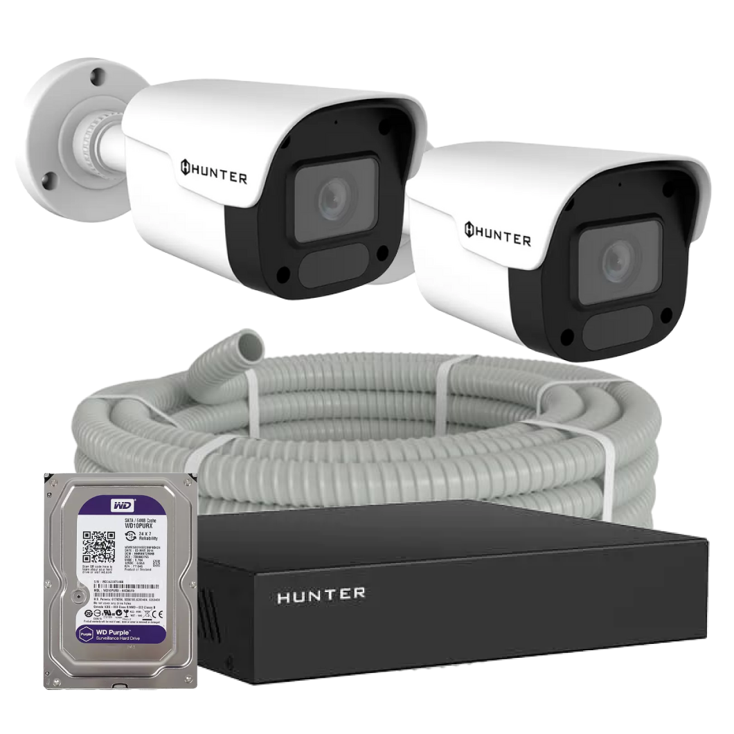 - 2 × MHD-видеокамера Hunter 5 Мп (HN-P2710IR или HN-D2710IR, 2.8 мм) — широкий угол обзора ~90°, ИК-подсветка до 20 м, защита IP66